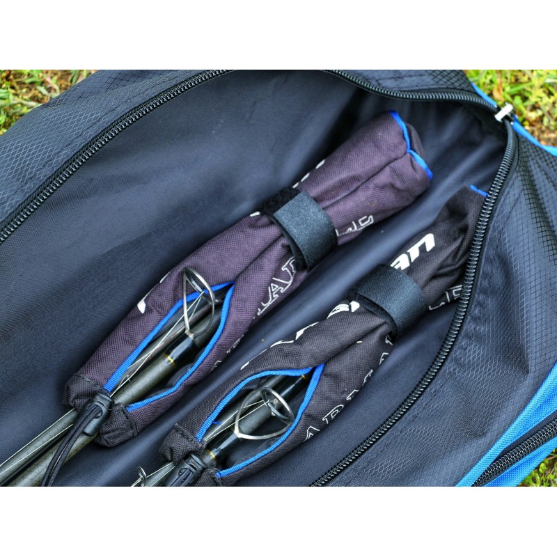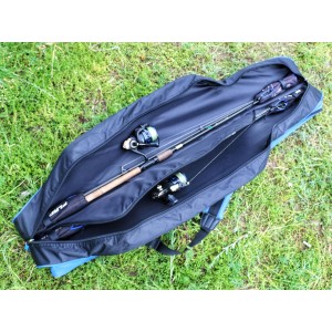 Полужесткий, качественный, роскошный чехол, предназначенный для размещения и переноски двух удилищ с катушками. Снаружи чехол оборудован большим объемным карманом для аксессуаров. Имеется качественная молния и усиленные ручки с плечевым мягким упором. Внутри чехла имеется вставка-разделитель, а также 4 ленты для фиксации удилищ.