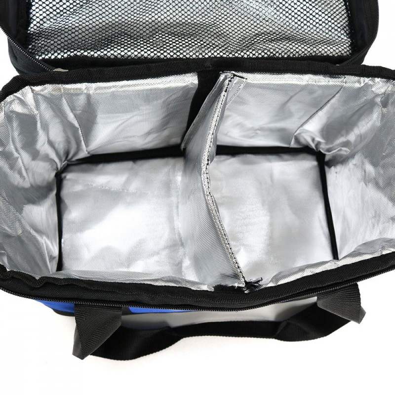 Высокого качества с толстой набивкой термосумка, основной отсек которой изолирован и над ним, в крышке, большой объемный карман для разной мелочевки. Также предусмотрены два сетчатых кармана под стенкой сумки. Модель комплектуется двумя качественными пластиковыми коробочками для насадки. В термо отделении практично хранить приманки, напитки и еду.