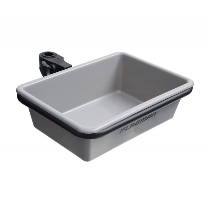 Прямоугольная пластиковая емкость, предназначенная для хранения небольшой порции прикормки в процессе ловли. Оборудована металлическим ободом с креплением, которое, благодаря специальным вставкам (входят в комплект), может фиксироваться на ноги платформы диаметром 25 и 30 мм.
