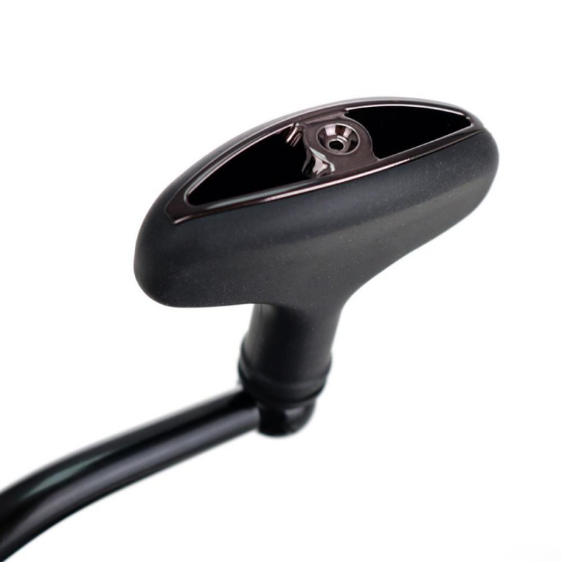 Цельнолитая дужка лесоукладывателя с карбонизированной направляющей лески повышает надёжность и долговечность. Алюминиевая рукоятка навинчивается непосредственно на ось приводной шестерни, что исключает люфт и холостой ход — каждое движение передаётся механизму без потерь. Резиновая рукоятка обеспечивает комфорт и уверенный хват.
