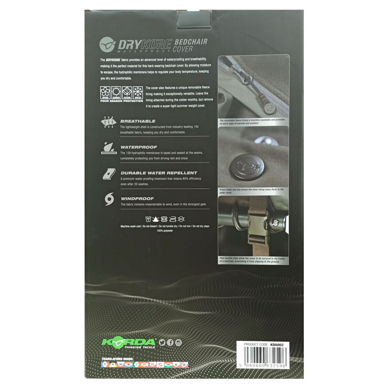 Накидка для раскладушки Dry Kore Bedchair Cover - универсальный вариант для выезда на карповую рыбалку и просто на отдых. Благодаря своей многофункциональности, позицию можно использовать как: чехол; накидку; теплое одеяло. Модель изготовлена из качественного, современного материала DRYKORE от Korda. Это значит, что она отличается высокими водостойкими, воздухонепроницаемыми и износостойкими характеристиками. Гидрофильная мембрана обеспечивает рассеивание влаги. Никакие дожди и роса вам не страшны. Просто стряхните с поверхности скопившуюся в виде капель влагу и снова можно пользоваться покрывалом по назначению! Накидка идеально сохраняет комфортную температуру тела. Съемный флисовый слой - дополнительное утепление на случай холодов. Между собой флисовый и легкий слой соединяются молнией и кнопками. Система застежек для фиксации чехла к ножкам кровати гарантирует надежное крепление накидки, что важно в случае ветреной погоды.