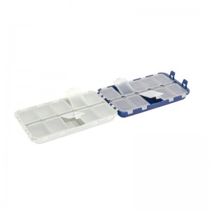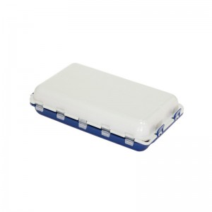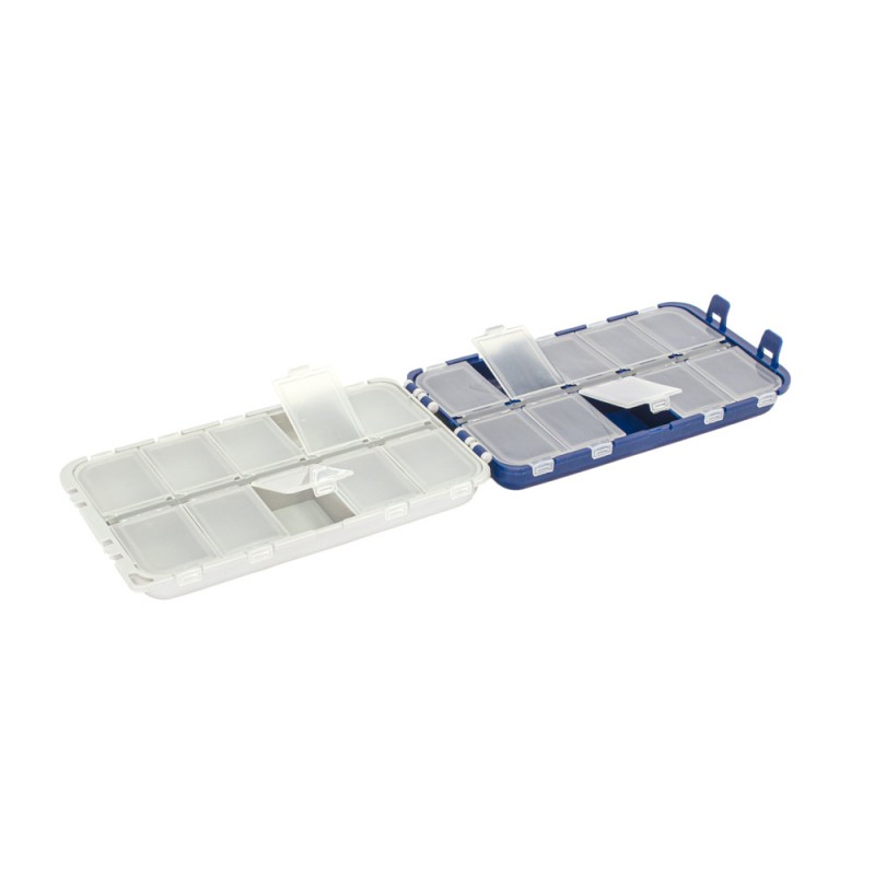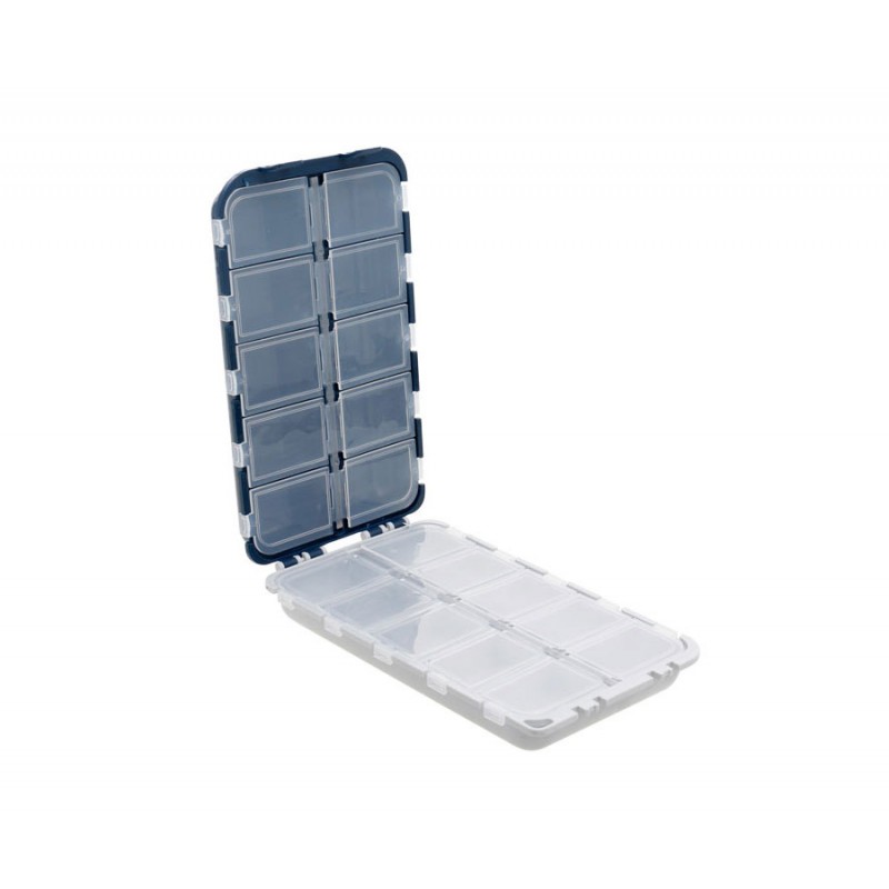 Коробка из полипропилена. Устойчива к воздействию масел, растворителей и силикона, предназначена для вертлюжков, мормышек, мелких блесен, миниатюрных джиговых приманок и т.д. Имеет две поверхности, которые оборудованы двадцатью маленькими отсеками с прозрачными крышками. Оснащена ушком для крепления и закрывается на защёлки.