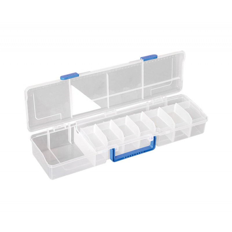Коробка увеличенной длины, оборудованная полочкой-вставкой. Удобна для хранения фидерных и поплавочных аксессуаров, а также элементов оснасток.