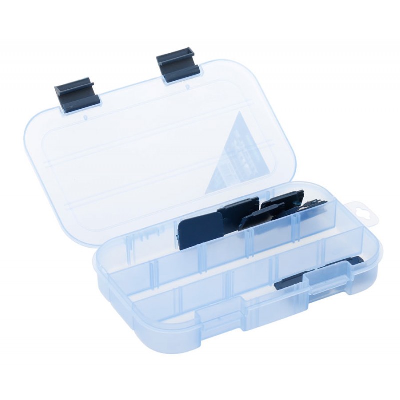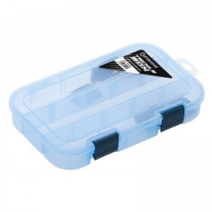 Коробка из полипропилена. Устойчива к воздействию масел, растворителей и силиконов. Оснащена тремя широкими отсеками для хранения приманок. Кроме того, каждый отсек делится ещё на несколько с помощью 10 съёмных перегородок. Крышка крепиться с помощью шарнирного соединения и закрывается на замок-защелку.