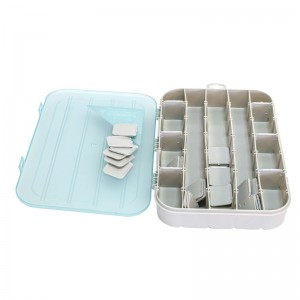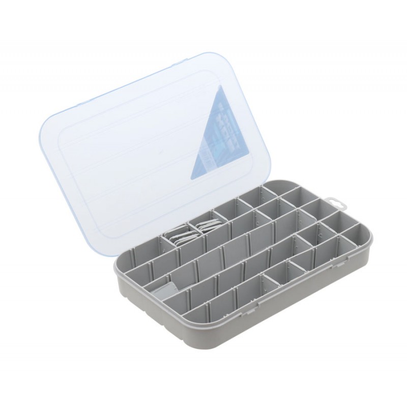 Рыболовная коробка из полипропилена. Устойчива к воздействию масел, силиконов и растворителей. Предназначена для хранения, как достаточно крупных приманок и аксессуаров, так и вертлюжков, застежек и т.д. Имеет одну основную поверхность, на которую устанавливаются до 30 перегородок, с помощью которых рабочие пространство можно составить самостоятельно. Коробка имеет прозрачную крышку и закрывается на защёлки. Оснащена ушком для крепления.