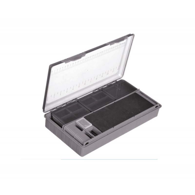 Коробка, которая вмещает две поводочницы, позволяющие хранить длинные поводки, а также шесть маленьких коробок для крючков и прочих элементов оснастки. Поводочницы дают возможность закреплять поводки разной длины. Для этого используются входящие в комплект булавки, которые втыкаются в боковые панели поводочницы, изготовленные из EVA. Для удобства изготовления поводков и оснасток на прозрачную крышку коробки нанесены сантиметровая и дюймовая шкалы. Размер, см: 34x18x6.0