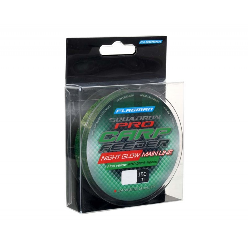 Flagman Squadron Pro Carp Feeder Night Glow Main Line – монофильная леска японского качества, изготовленная по передовым технологиям из самых современных полимеров. Предназначена для использования в качестве основной лески на карп-фидерной снасти. Отличается исключительно гладкой поверхностью и средней жесткостью, что дает возможность выполнять дальние и точные забросы. К достоинствам Squadron Pro Carp Feeder Night Glow Main Line также можно отнести минимальную растяжимость, повышенную устойчивость к абразиву, высокую прочность, в том числе и на узлах, минимальный коэффициент памяти, точную калибровку. Камуфляжная окраска с черными вкраплениями отлично маскирует ее на дне водоема. Благодаря вкраплениям, рыба не воспринимает леску как прямую линию, поэтому не настораживается. Кроме того, как все лески Fluo, она прекрасно заметна в свете фонаря в темное время суток, что значительно облегчает процесс вываживания. Леска Flagman Squadron Pro Carp Feeder выпускается в наиболее востребованных диаметрах и размотке 150 м.