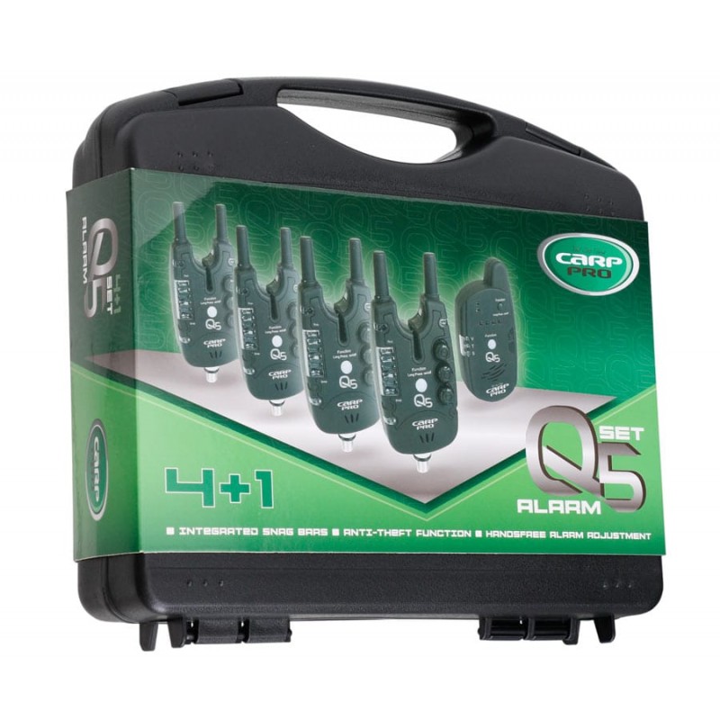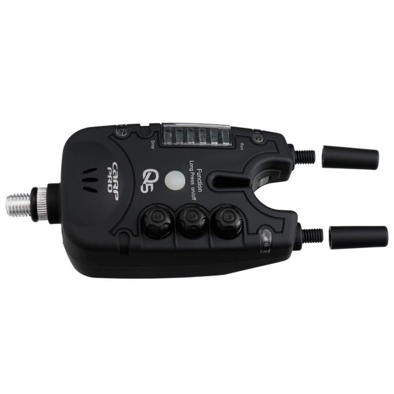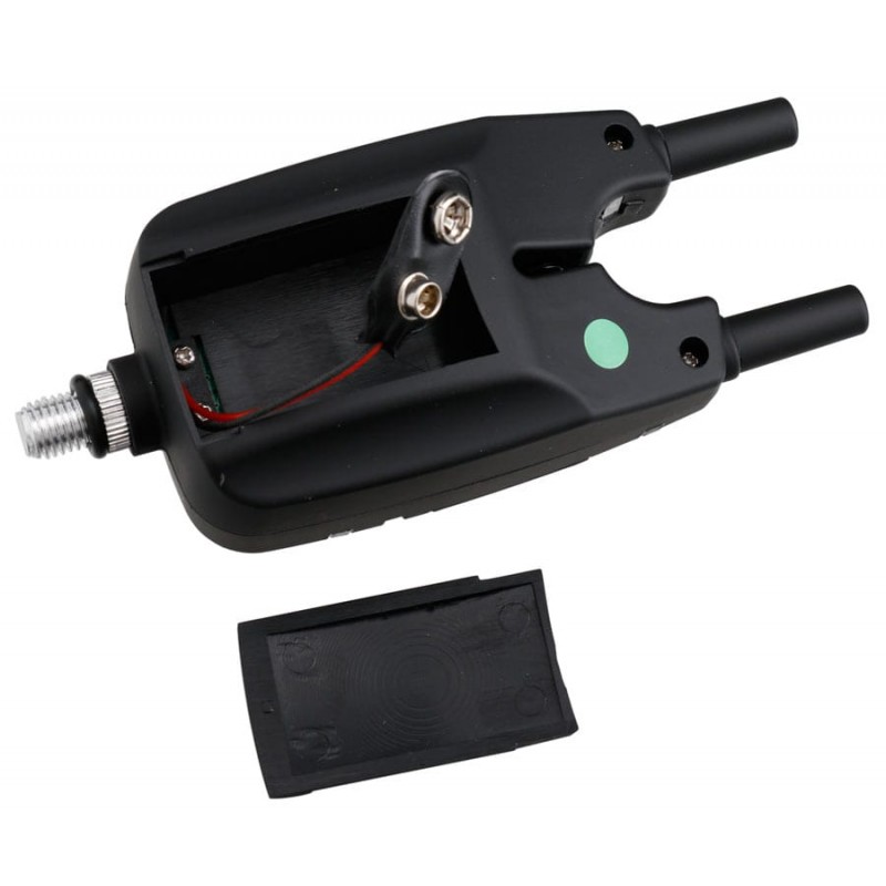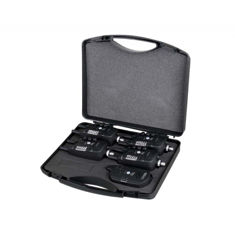 Набор высококлассных карповых сигнализаторов. Поставляются в комплектах 3+1 (красный, синий, зеленый + ресивер) и 4+1 (красный, синий, зеленый, желтый + ресивер). Прочный корпус сигнализатора выполнен из пластика, имеет влагозащиту и оборудован встроенными (и при этом съемными) Snag Ears, которые не дают удилищу упасть при порывах бокового ветра и мощных поклевках. Сигнализатор выдает разные звуки при поклевках от берега и к берегу. Звук дублируется световой индикацией: бегущая дорожка светодиодов показывает направление поклевки. На корпусе установлены три ручки, которые регулируют тон, громкость звука, а также чувствительность сигнализатора. Во время вращения ручки упомянутый световой индикатор отображает установленный уровень громкости, тона, чувствительности – в зависимости от того, какую ручку вращать. На передней панели находится датчик освещенности, который в темное время суток включает ночной режим – подсветку центральной белой кнопки. Сигнализатор оборудован «антикражем»: если его включить, то при снятии удилища с сигнализатора включается громкий звуковой сигнал, сопровождающийся миганием подсветки. Ресивер показывает не только какой сигнализатор зафиксировал поклевку, но и в каком направлении эта поклевка – от берега или к берегу. Прямо с ресивера можно дистанционно менять громкость и тон звука, а также чувствительность на каждом из сигнализаторов. Вместо звукового сигнала, громкость которого регулируется, может быть включен вибросигнал. Для питания сигнализаторов используются батарейки типа «Крона», для ресивера – элементы ААА (элементы питания в комплект не входят). Набор поставляется в надежном пластиковом кейсе.