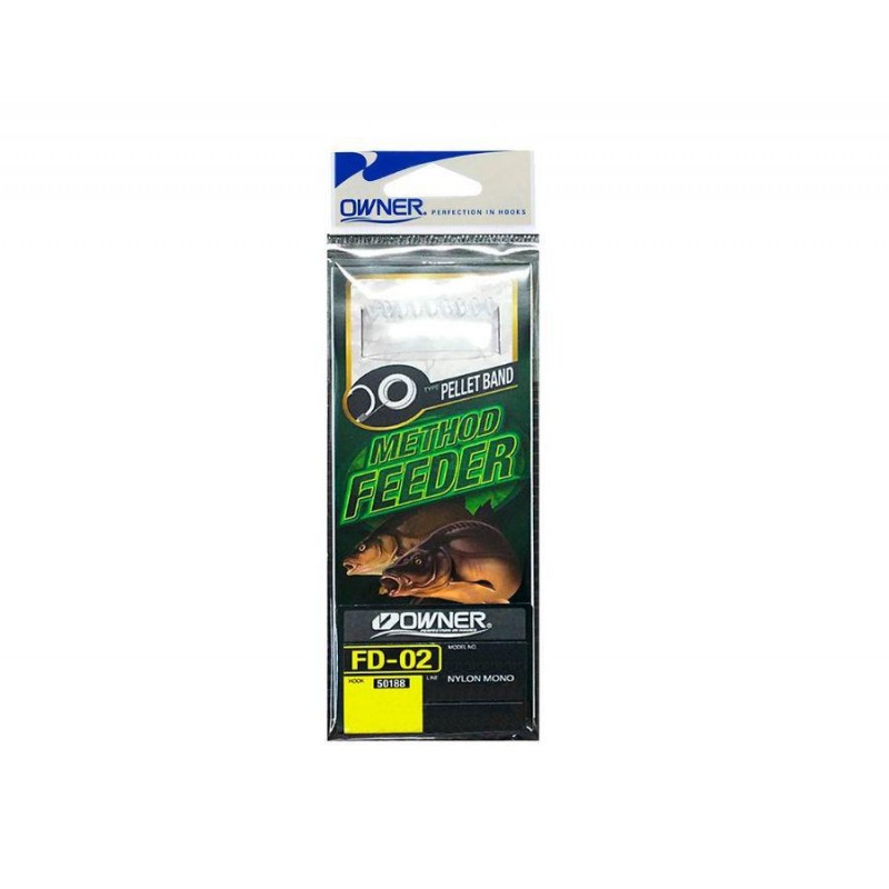 Крючки Owner Method Feeder Rig Pellet Band FD-02 для карпфишинга и другой мирной рыбы, с готовым поводком, для облегчения монтажа при фидерной ловле на берегу водоемов и экономии времени. Эти крючки с поводком предназначены для монтажа по типу Feeder Method в Карпфишинге, с готовой фиксацией для удерживания наживки на волосе монтажа возле крючка. Что облегчает и экономит время при наживлении насадки на монтаж. Система монтажа Rig Pellet Band FD-02 предназначена для наживления плавающих наживок, на примере бойлов Pop-Up. Фиксация данного типа наживок осуществляется за счет силиконового кольца в которое помещают наживку. Оно фиксирует наживку, и за счет своей эластичности в момент растворимости наживки в воде продолжает удерживать ее до полного растворения в воде. Длина поводков составляет 10 см, а диаметр лески с разрывной нагрузкой подобран под размеры крючков в соответствии с предполагаемыми нагрузками и размерами рыбы и ловли под тип монтажа Feeder Method.