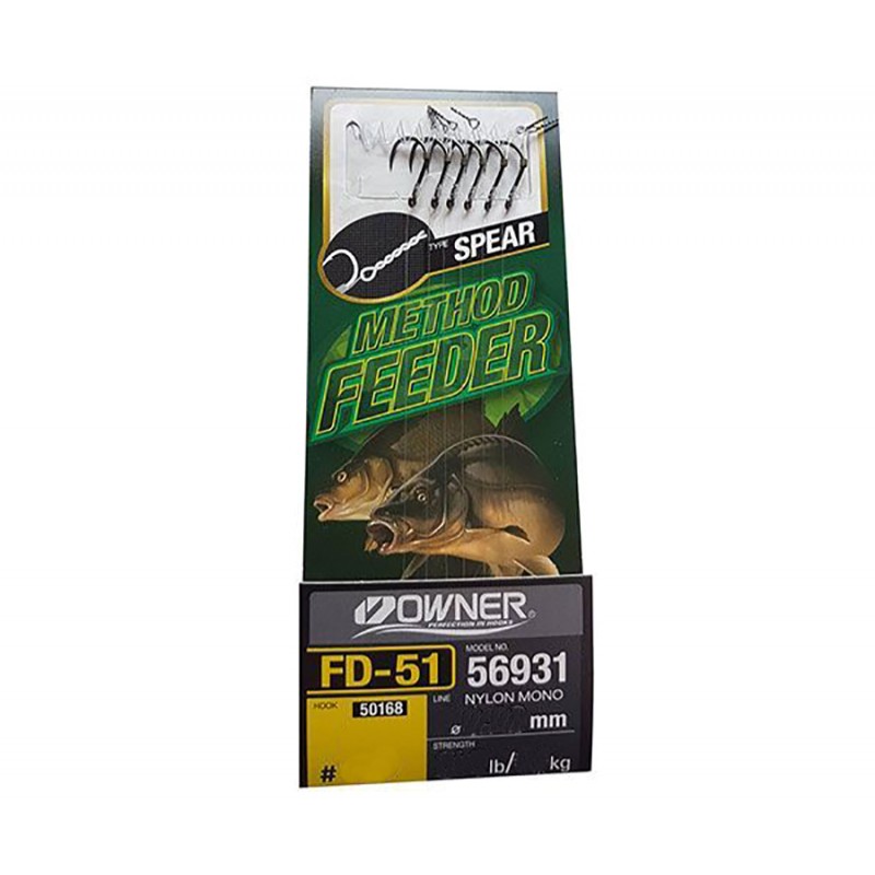 Owner Method Feeder Spear Barbless FD-51– серия готовых поводков для метод-фидерной ловли карпа и прочей рыбы. Волосяной монтаж изготовлен с применением высококачественной лески и надежных крючков. Кроме того на волосе предусмотрена спиральная вкрутка (винт-сверло), которая предназначена для крепления бойлов и прочих насадок, и выполнена в виде скрутки из нержавеющей проволоки. В поводках Owner 56931-51 используются крючки без бородки, имеющие широкий загиб, загнутое в сторону цевья жало и слегка укороченное цевье с колечком. Покрытие темного цвета защищает крючок Owner Method Feeder Spear Barbless от коррозии и маскирует его на фоне дна. Сверхострое жало, сохраняющее заточку даже в самых сложных условиях, и отсутствие бородки гарантируют не только эффективную подсечку клюнувшей рыбы, но и минимальное нанесение повреждений последней.