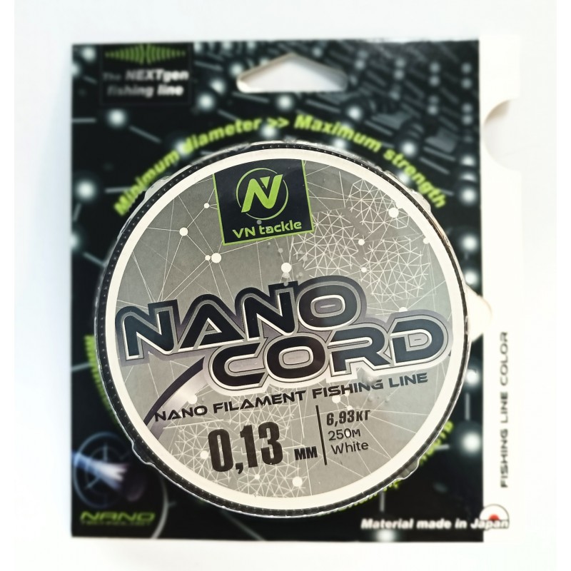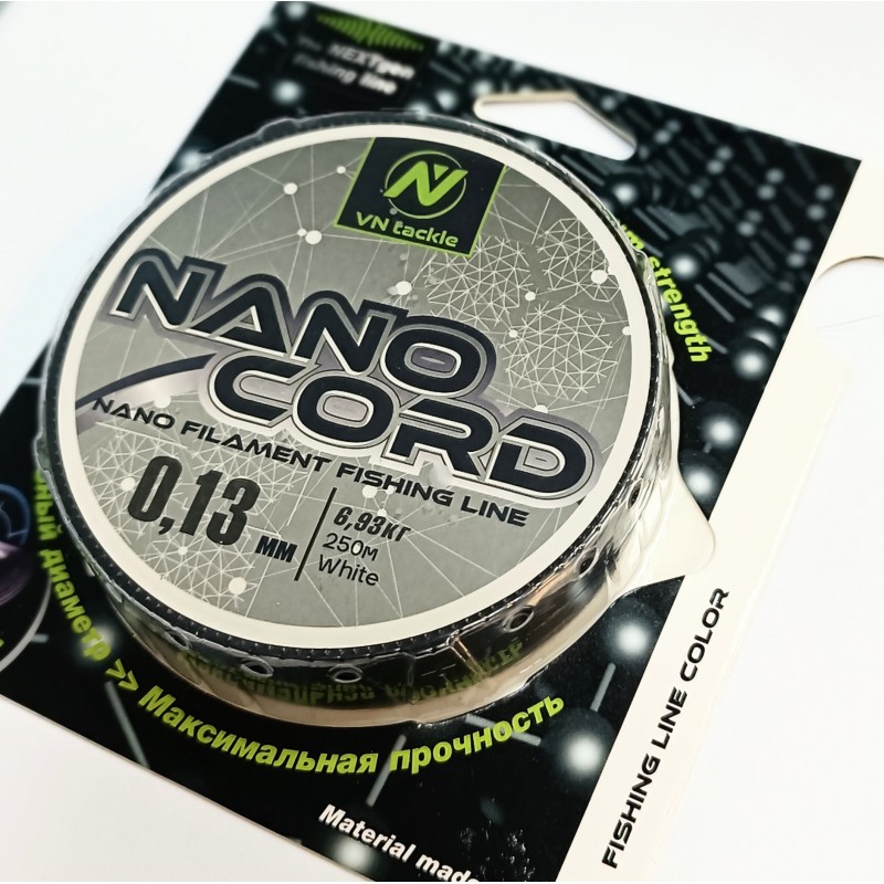 Шнур нового поколения, изготовленный из материалов «Dyneema» по современным нано технологиям, что делает его невероятно прочным, при минимальных диаметрах. NanoCord обладает очень гладкой структурой и выдающимися полётными характеристиками, за счет минимального трения. Практически не имеет памяти и растяжения, что дает максимальную чувствительность при ловле на дальних дистанциях.