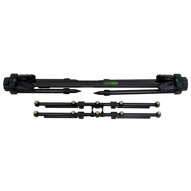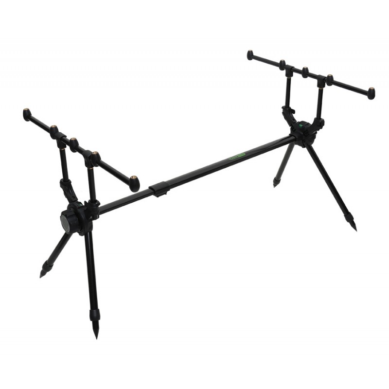 Ключевые преимущества этой модели — компактные размеры в сложенном состоянии, а также возможность его хранения и транспортировки в тубусе. Жесткий тубус изготовлен из плотной, синтетической ткани, сверху закрывается на молнию. Все элементы род-пода — как пластиковые, так и металлические — выполнены из легких и качественных материалов. Общая длина подставки для удилищ составляет около 85 см в сложенном положении и достигает 135 см при максимальном растяжении. Модель оснащена телескопическими ножками, длина которых составляет 24 см для одной пары и 33 см для другой. Ножки можно удлинить еще на 17 и 20 см соответственно. Ширина бузбара составляет 58 см, а его высота может регулироваться в пределах 15 см. Дополнительный плюс — род-под оснащен двумя пузырьковыми уровнями, которые расположены по бокам изделия. Такой род-под рассчитан на 3 и 4 удилища и, благодаря быстрозажимным винтам и защелкам, весьма удобен на карповой сессии.