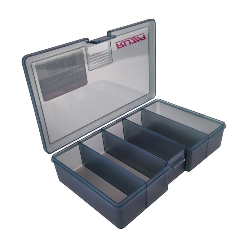 Односторонняя коробка для хранения приманок и аксессуаров из ударопрочного армированного пластика PP (полипропилен).Коробка имеет четыре фиксированные перегородки, делящие ее на 5 самостоятельных отсеков.