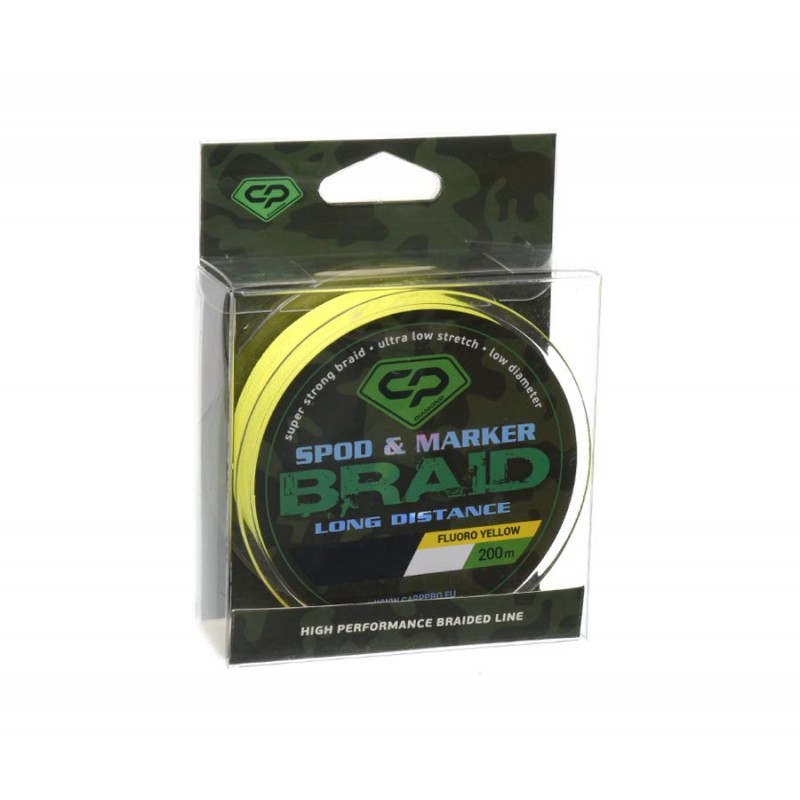 Carp Pro Spood & Marker Braid PE X4 Long Distance – мягкий, тонкий, прочный и устойчивый к истиранию плетеный шнур флуоресцентно-желтого цвета. Предназначен для использования со сподовыми и маркерными удилищами. Малый диаметр способствует увеличению дальности и точности забросов. Доступен с разрывной нагрузкой 20 lb в размотке 200 м.Характеристики Carp Pro Spood & Marker Braid:- Высококачественный 4-жильный PE шнур - Малый диаметр способствует увеличению дальности забросов- Высокая прочность на узлах- Отлично виден при любой освещенности