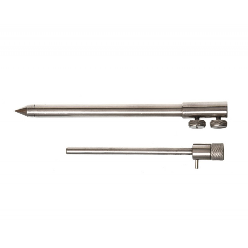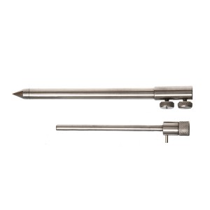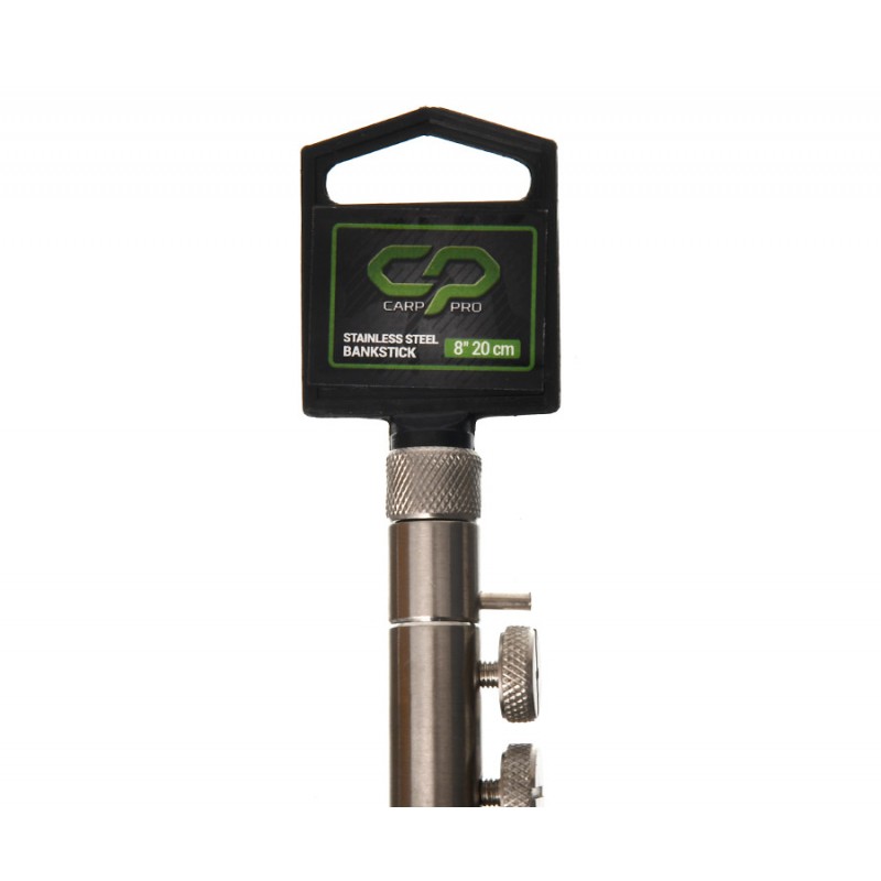 Carp Pro Stainless Steel Bankstick – телескопическая стойка из нержавеющей стали. Не имеет ни одной пластмассовой детали и отличается высокой надежностью и современным дизайном. Для максимально надежной фиксации верхняя часть стойки (внутренний прут) крепится к нижней части двумя винтами. Винты можно закрутить от руки либо при помощи отвертки: на головках винтов есть насечка и шлицы под отвертку. Нижняя часть снабжена острием, легко проникающим в грунт. Резьба позволяет установить на стойку Carp Pro Stainless Steel Bankstick буз-бар, сигнализатор поклевки, держатель комля и т.п., а широкая контргайка и стержень-упор для пальца – надежно зафиксировать установленное оборудование в нужном вам положении. Банкстик телескопический Carp Pro Stainless Steel Bankstick 8" имеет длину 20-30 см.