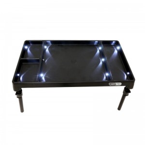 Компактный, удобный и легкий пластиковый монтажный столик с LED-подсветкой. Благодаря складной конструкции занимает весьма мало места. Телескопические ноги позволяют изменять высоту столика и располагать его на неровном берегу. Имеет бортики, которые разделяют рабочую поверхность стола на отделения и не позволяют предметам падать на землю. Благодаря светодиодной подсветке стол чрезвычайно удобен для вечерней и ночной рыбалки, а также способен выступать в качестве «ночника» внутри палатки. Таким образом, столик позволит качественно подготовить насадку или найти нужные вещи. При этом яркость свечения светодиодов плавно регулируется. Автономное питание стола осуществляется от одной батарейки типа «Крона» 9В. ВНИМАНИЕ! Производитель настоятельно рекомендует извлекать элемент питания, когда в подсветке нет необходимости. Несоблюдение данной рекомендации может привести к преждевременному разряду элемента!