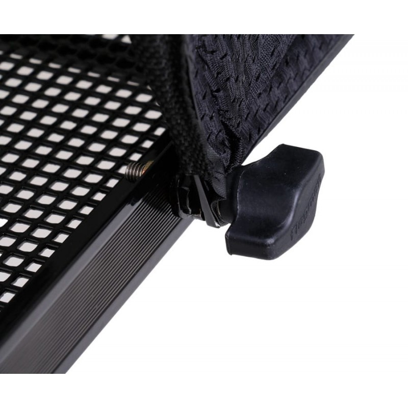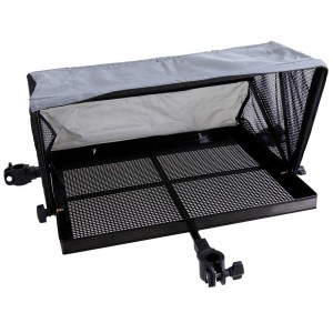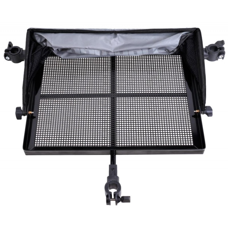 Боковой столик для платформы, отличающийся увеличенным размером. С одной стороны он крепится к ноге платформы, с другой – опирается на две дополнительные ноги (приобретаются отдельно). Оборудован складным тентом для защиты наживки и прикормки от солнца и дождя. Тент крепится к столику винтами с удобными пластиковыми ручками, благодаря чему быстро отсоединяется и устанавливается. Перфорированная конструкция обеспечивает хорошую вентиляцию при закрытом тенте и не дает воде скапливаться на рабочей поверхности. Выполнен из прочного алюминиевого сплава. Благодаря специальным вставкам (входят в комплект) может фиксироваться на ноги платформы диаметром 25 и 36 мм.