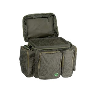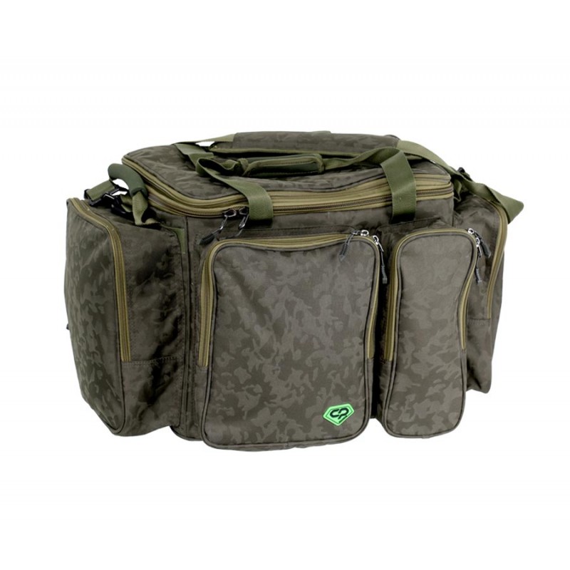 Большая и вместительная карповая сумка со столиком в комплекте. Сумка выполнена из прочного полиэстера и оснащена двумя фронтальными и двумя боковыми карманами на молниях. Замки молний оборудованы прорезиненными «ухватками». Столик имеет тканевое основание с упругим наполнителем. Такое решение позволяет установить стол горизонтально даже на неровной поверхности. Размер столика — 42x31x6 см. Достаточно высокий бортик по периметру стола не позволит скатиться и упасть вещам или рыболовным аксессуарам на землю. Кроме того, столик можно закрепить непосредственно на сумке сверху — для этого предусмотрены две Fastex защелки. Для удобства транспортировки предусмотрены две ручки с неопреновой накладкой и регулируемый наплечный ремень с эргономичной вставкой.