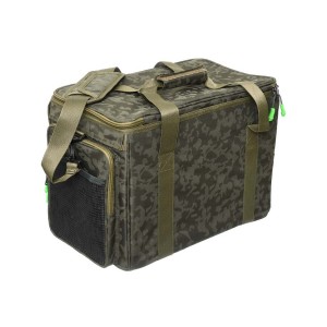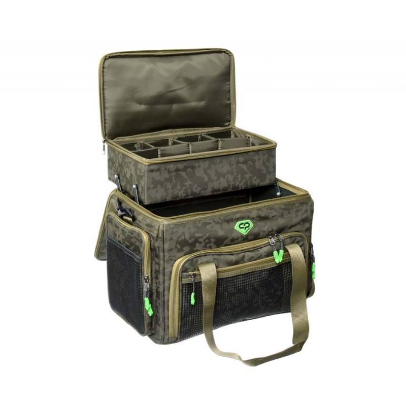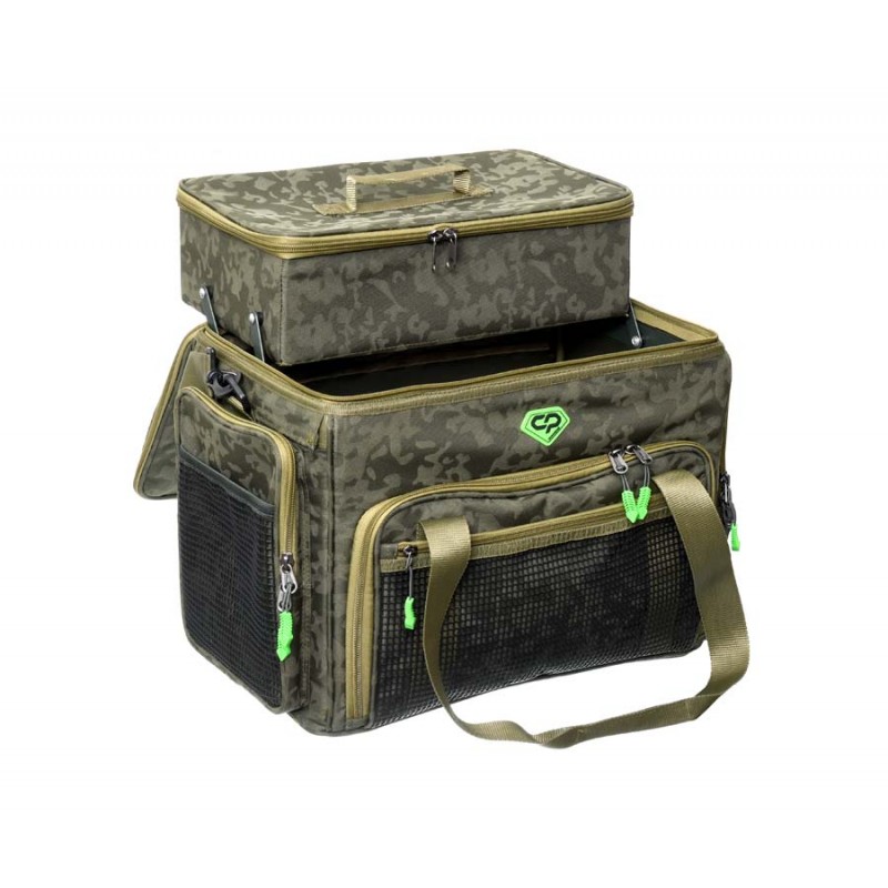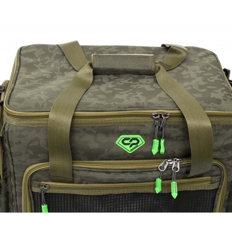 Carp Pro Diamond Multi Bag – мультифункциональная сумка с металлической жесткой рамой. Предназначена для транспортировки и хранения рыболовного снаряжения и аксессуаров. Изготовлена из фирменного влагостойкого камуфлированного материала Oxford 650D. Diamond Multi Bag имеет жесткие стенки, на которых смонтирован механизм выдвижного внутреннего бокса на металлических кронштейнах. Этот жесткий бокс разделен на несколько многофункциональных съемных отделений на липучке и предназначен для хранения разнообразнейшего снаряжения: запасных шпуль, прикормок, банок с дипами и насадками, маркерных поплавков, сподовых ракет и т.д. и т.п. Кроме того бокс может использоваться в качестве монтажного столика. Доступ к вместительному внутреннему отделению осуществляется через фронтальный клапан на двусторонней молнии. Здесь прекрасно разместятся карповые катушки, коробки и боксы со снастями, прочее объемное снаряжение. На клапане предусмотрен накладной прозрачный сеточный карман. Вместительные боковые карманы также оборудованы прозрачными сеточными кармашками. На крышках и карманах установлены надежные молнии. Благодаря жесткости конструкции, сумка отлично держит форму и защищает содержимое от повреждений. Для удобства транспортировки предусмотрены прочные ручки и регулируемый наплечный ремень с мягкой накладкой.