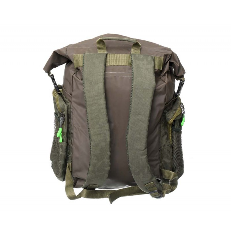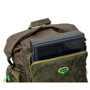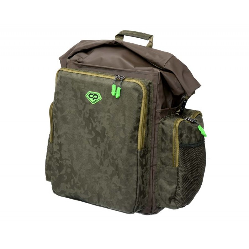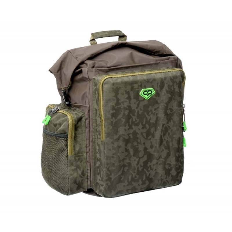 Водозащищенный рюкзак-сумка Carp Pro Diamond Waterproof Rucksack, выполненный из камуфлированного материала Oxford 650D и полностью водонепроницаемой ткани с ПВХ-покрытием и герметичными швами, пригодится в тех случаях, когда сохранность вещей и снаряжения от воды выходит на первый план. В полностью непромокаемое и достаточно большое главное отделение с легкостью вмещаются коробки, небольшие сумочки со снастями, одежда и прочая экипировка. Закрывается отделение наподобие гермомешка: две гибкие пластины на горловине складываются вместе, на них наматывается сама горловина, после чего пластины сгибаются и фиксируются в таком положении защелкой-фастекс, не давая горловине размотаться и открыться. Большой фронтальный карман сумки-рюкзака Diamond Waterproof Rucksack укомплектован пластиковой коробкой для монтажей и аксессуаров. Два боковых кармана для аксессуаров также достаточно вместительны и оснащены надежными молниями. Кроме того по бокам рюкзака есть два небольших открытых ПВХ-кармана для непромокаемой мелочевки – грузил, кормушек и т.п. Спинка Waterproof Rucksack оборудована мягкими вставками, покрытыми сетчатой тканью, которые способствуют равномерному распределению давления. Рюкзак имеет удобную ручку для переноски и мягкие регулируемые лямки.