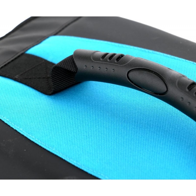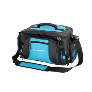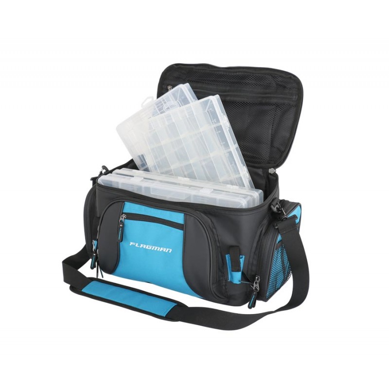 Достаточно большая и вместительная спиннинговая сумка на молнии с набором коробок. Сумка выполнена из прочной синтетической ткани. Оснащена двумя боковыми карманами, наплечным ремнем с эргономичной накладкой и усиленной ручкой. В комплект входят четыре коробки из прозрачного пластика с ячейками для мелких рыболовных аксессуаров и принадлежностей. Размер коробки — 35x23x4,5 см. Вес сумки с набором коробок — 2,5 кг.