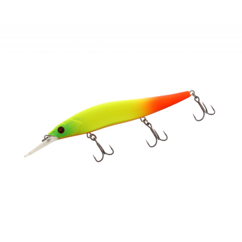 Плавающий воблер Flagman Bossy 110 F DR – отличная приманка для быстрого и эффективного облова обширных мелководий, несмотря на его большую лопатку. Это воблер minnow вытянутой формы, весит он 14,4 г и имеет длину 110 мм. Благодаря системе дальнего заброса летит не только далеко, но и очень точно. Подвижные стальные шарики при забросе уходят далеко в хвост, смещая туда центр тяжести. При первом же рывке они возвращаются на место и фиксируются специальным приливом снизу, благодаря чему при проводке балансировка приманки остается неизменной. Шарики издают негромкий звук высокой частоты. Воблер обладает собственной игрой, но равномерная проводка не выступает основной, его специализация – твичинг. При рывках Bossy совершает длинные «заплывы» по инерции, имеющие сложную траекторию. Причем, он сразу резко отклоняется в сторону, и амплитуда его движений получается довольно большой. Данная модель Bossy – плавающая, после остановки движения приманка медленно всплывает в толще воды, что часто провоцирует на атаку щуку и крупного окуня. Лобовое сопротивление воблера не слишком велико, поэтому для рывковой проводки нет необходимости использовать сверхжесткие удилища.