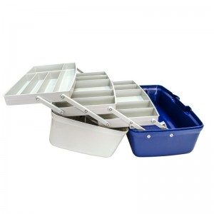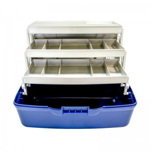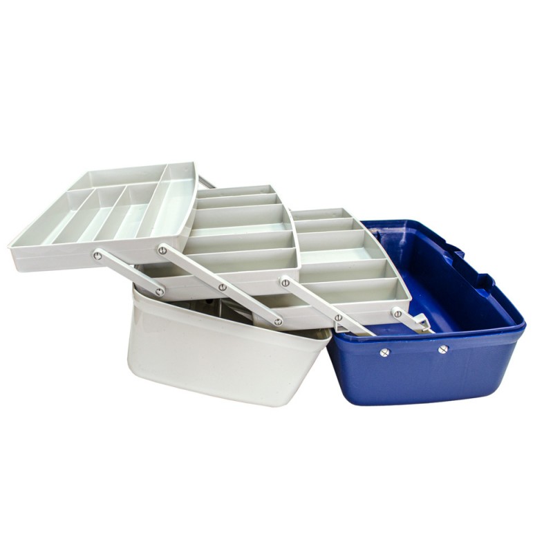 Трёхполочный ящик для рыболовных снастей. Изготовлен из полипропилена, устойчив к воздействию масел, растворителей и силиконов. Блок из трёх полочек имеет раскладную конструкцию. В транспортном положении полочки плотно прилегают друг к другу, не давая содержимому рассыпаться. Система фиксированных и съёмных перегородок позволяет формировать внутренние пространство по своему усмотрению. Основное отделение ящика не имеет перегородок и предназначено для хранения крупных предметов. Оснащен плотной крышкой, которая крепиться с помощью шарнирного соединения, закрывается на замок-защелку. Подходит для транспортировки и хранения любых приманок.